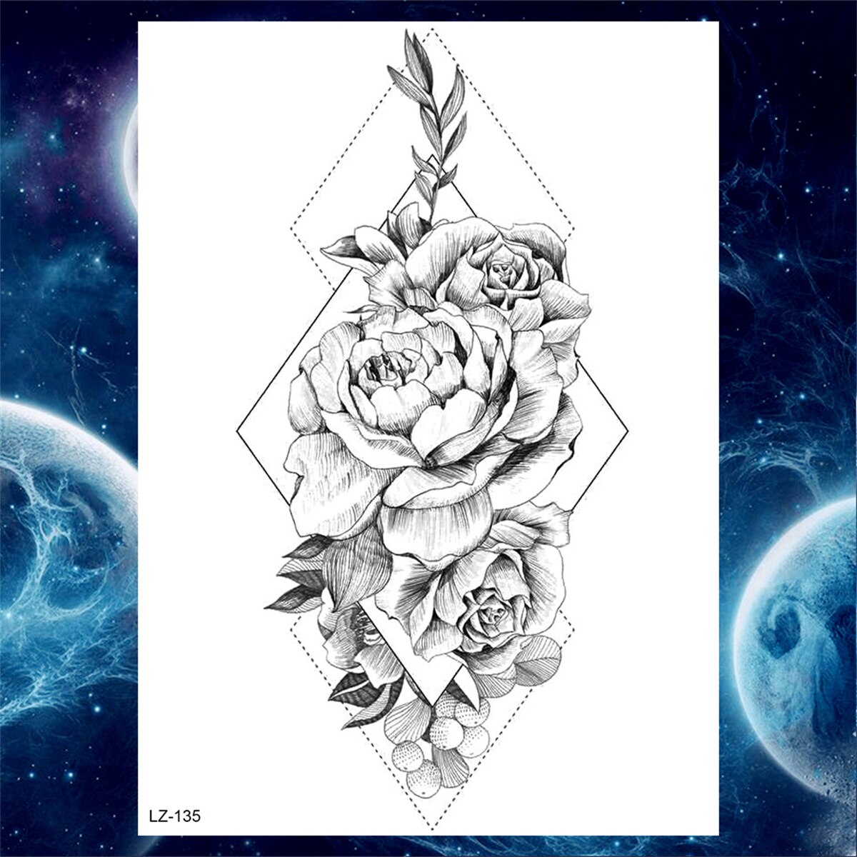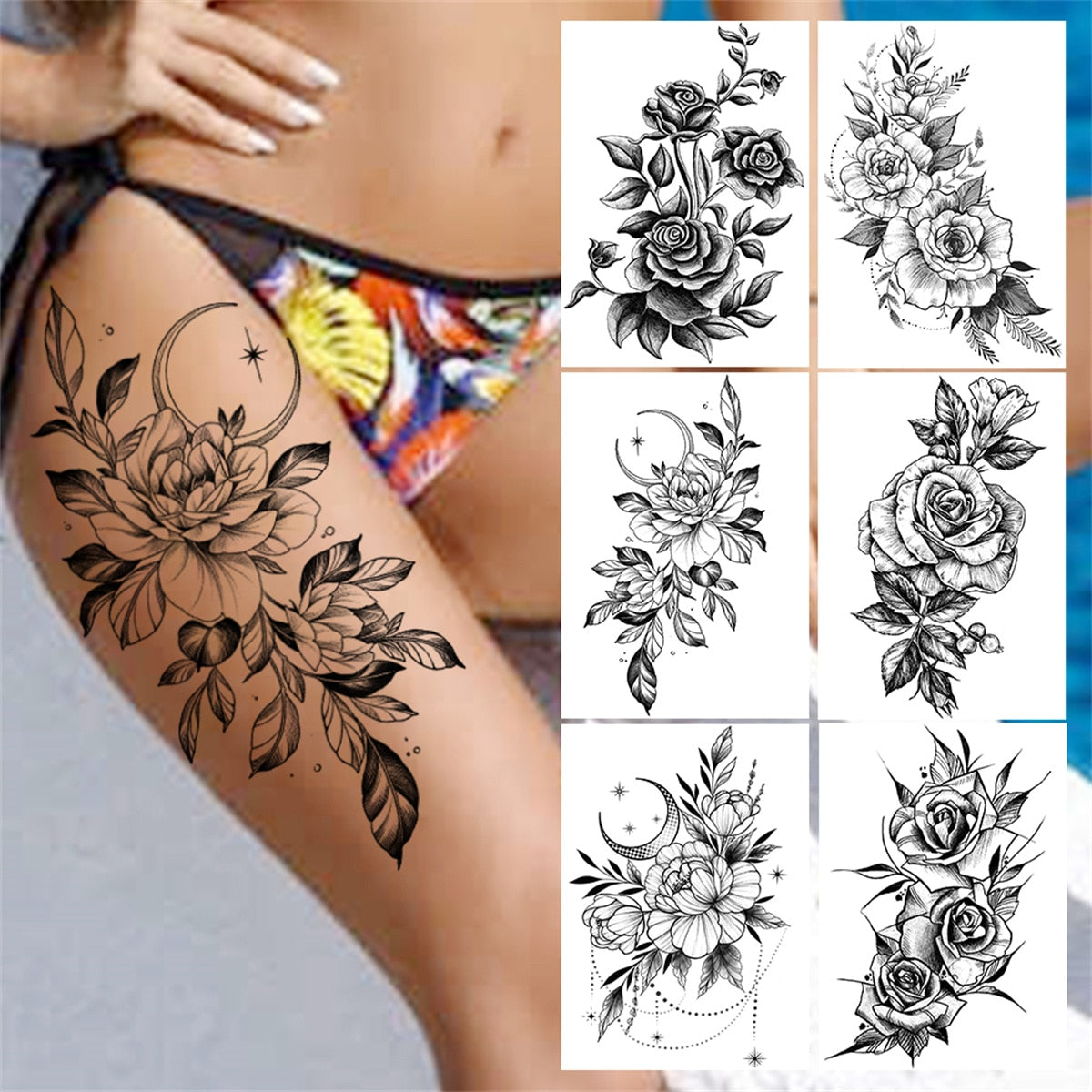 Moon Peony Flower Temporary Tattoos For Women Adults Girls Rose Tattoo Sticker Fake Crescent Black Water Transfer Tatoos Thigh