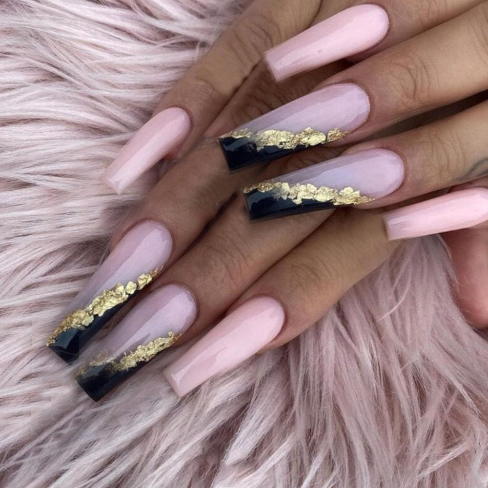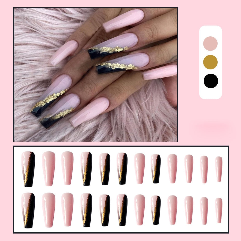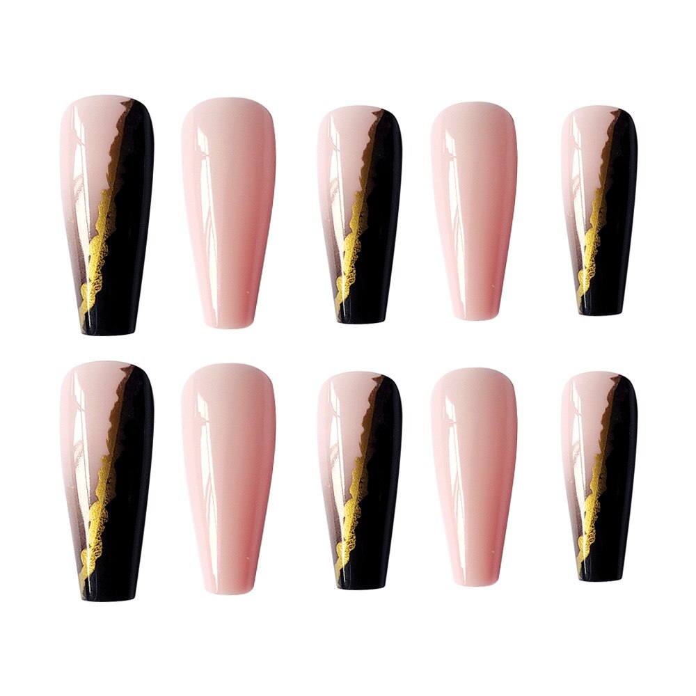 Nude Pink False Nails Fashion Long Black Gold Gradient Coffin Fake Nails Press On Nails Artificial Ballerina Nail Art Full Tips