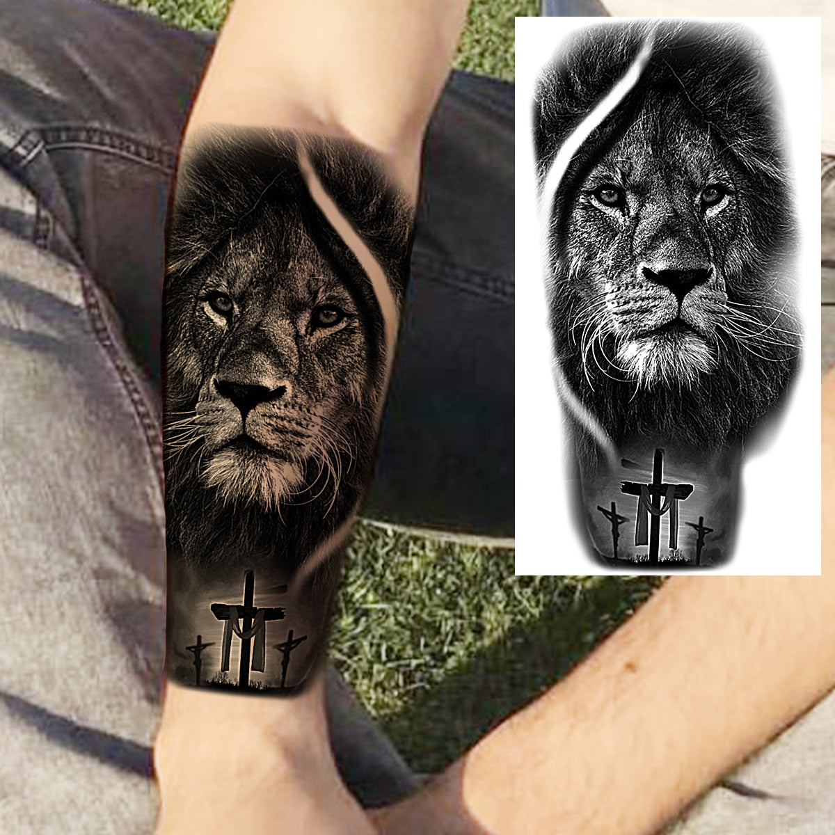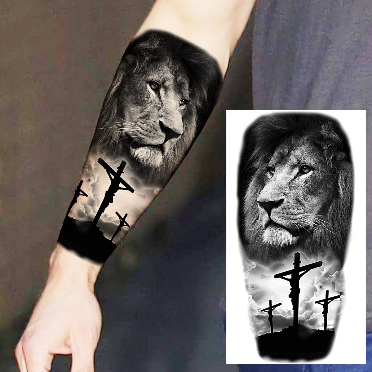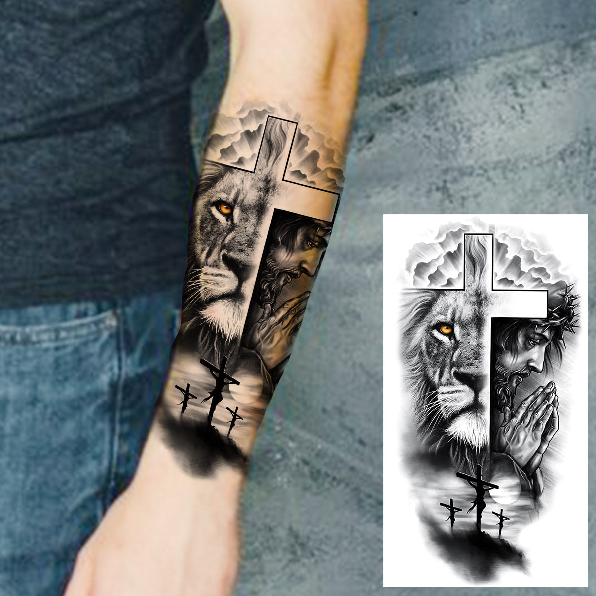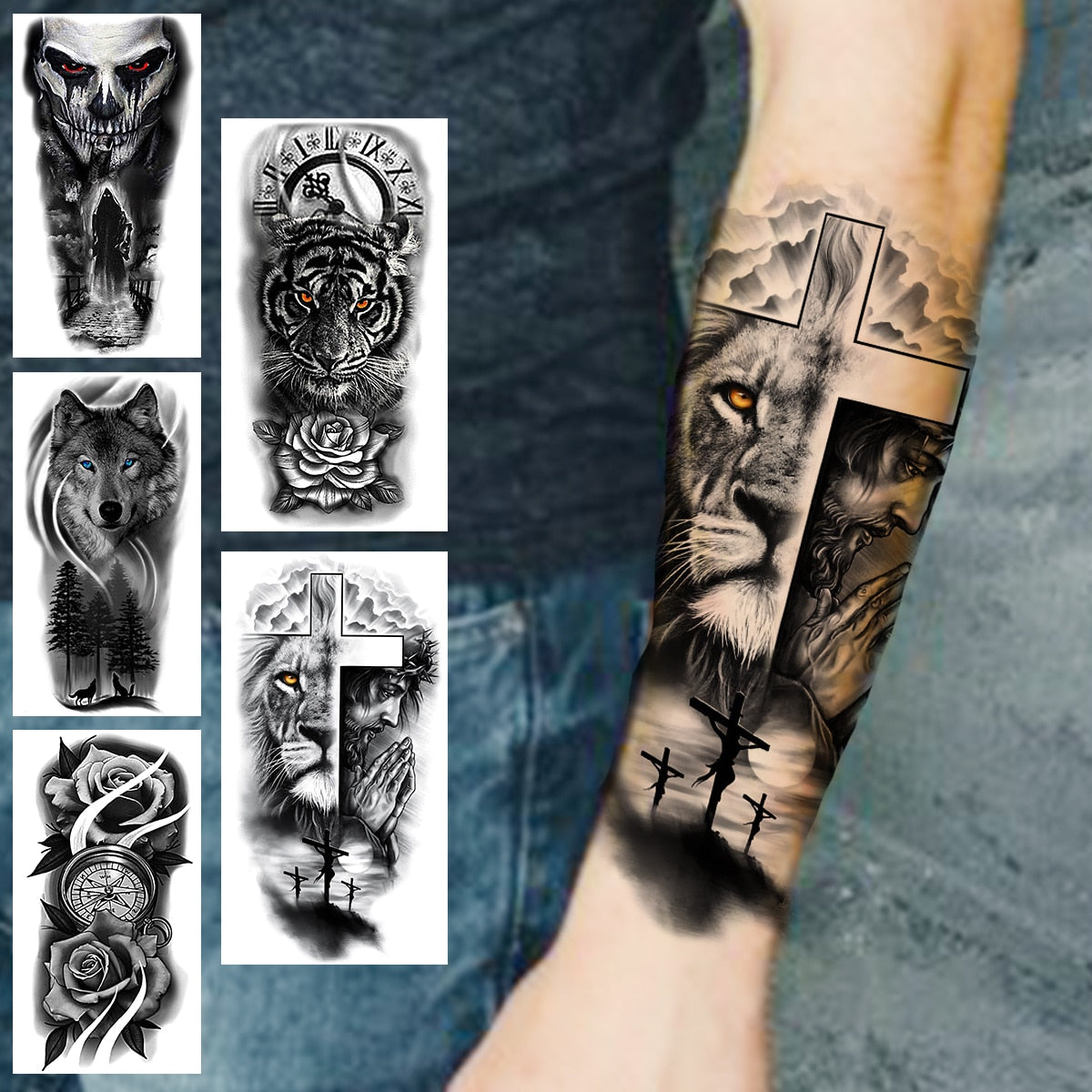 Praying Lion Cross Temporary Tattoos For Men Women Clown Wolf Tiger Flower Compass Fake Tattoo Sticker Forearm Waterproof Tatoos