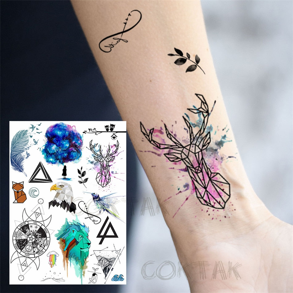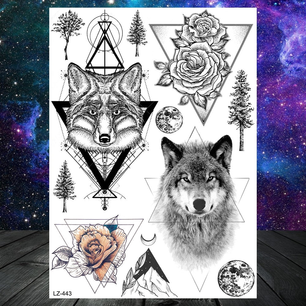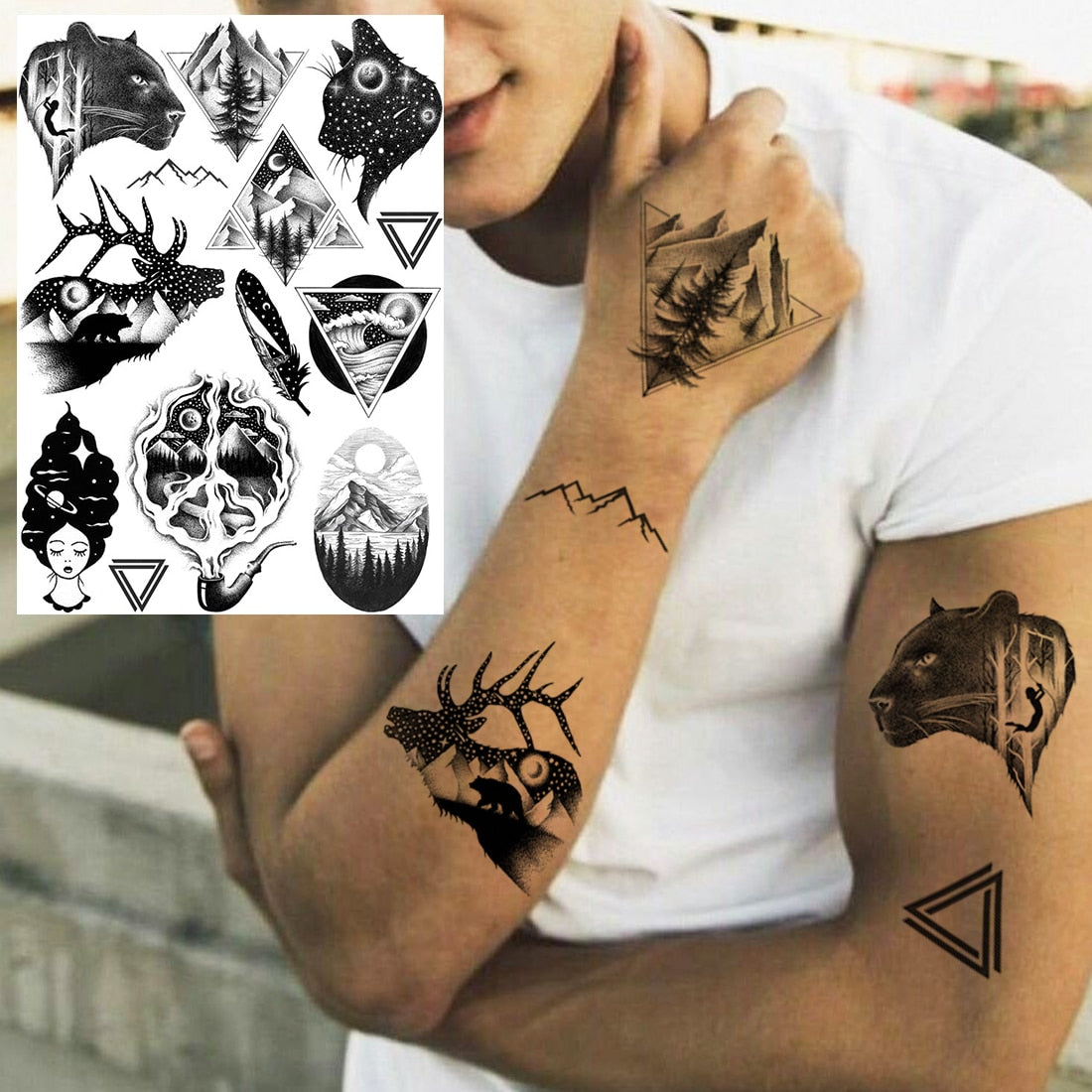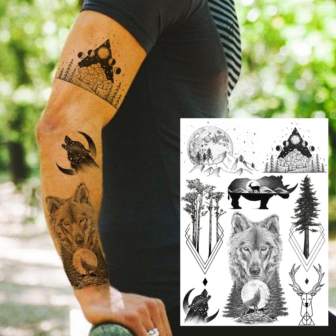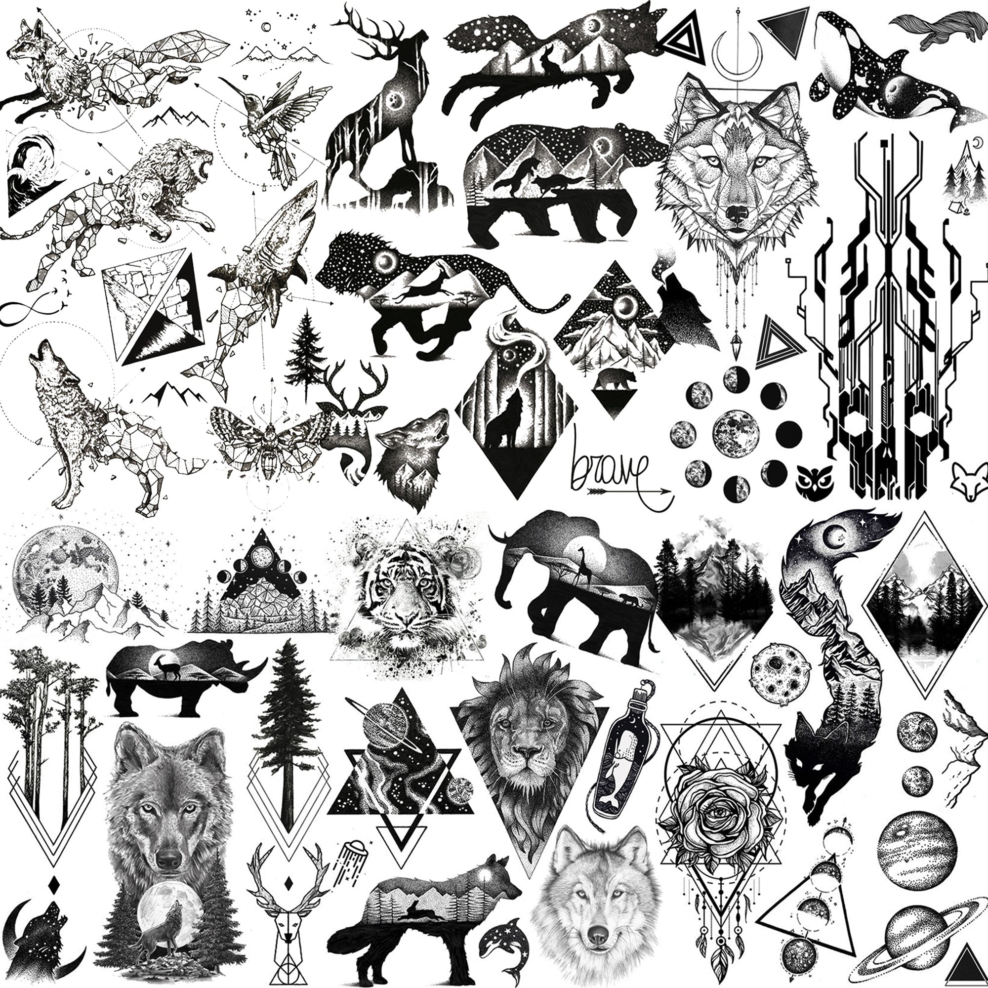 Realistic Fake Black Animal Temporary Tattoos Sticker For Men Women Geometric Wolf Outer Space Tatoo Temporary Decal For Kids
