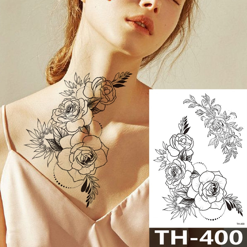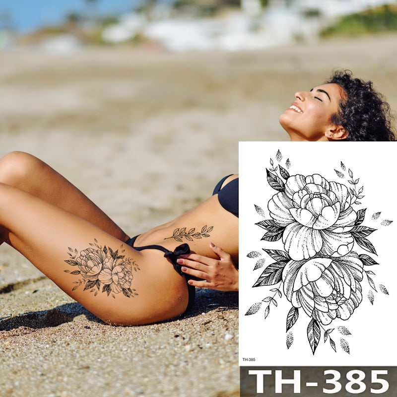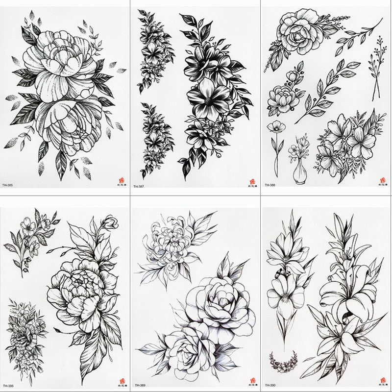 Rose Peony Flower Girls Temporary Tattoos For Women Waterproof Black Tattoo Stickers 3D Blossom Lady Shoulder DIY Tatoos