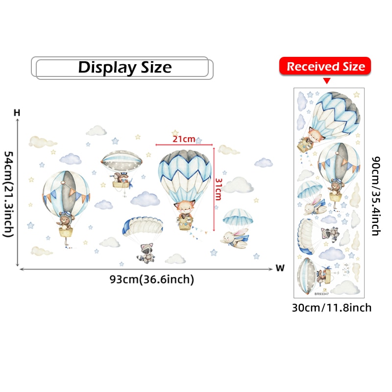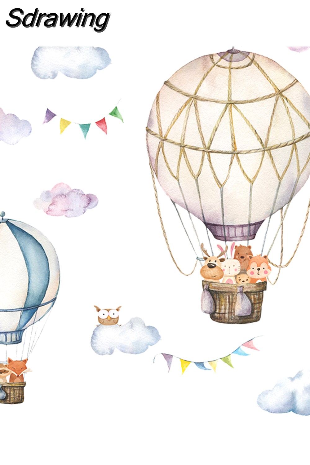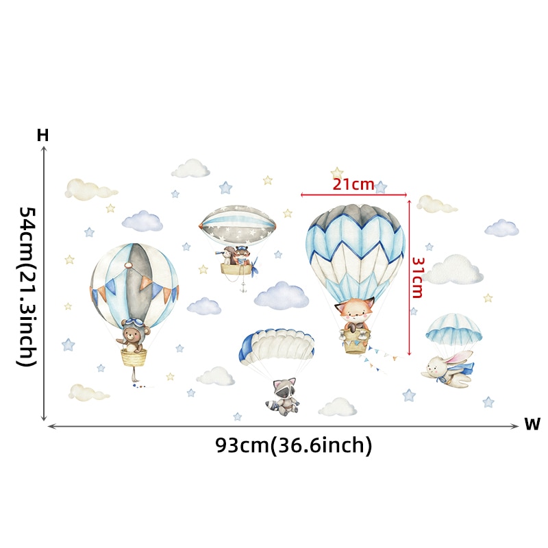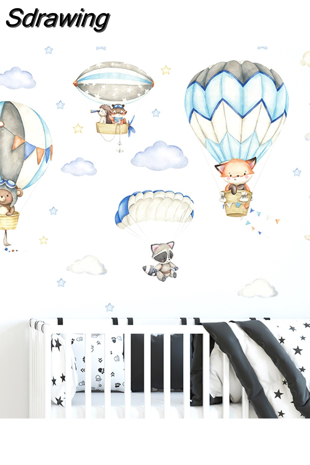 Sdrawing Animals Hot Air Balloon Clouds Wall Stickers Blue Color for Kids Room Baby Nursery Room Wall Decals Boy Room Stickers