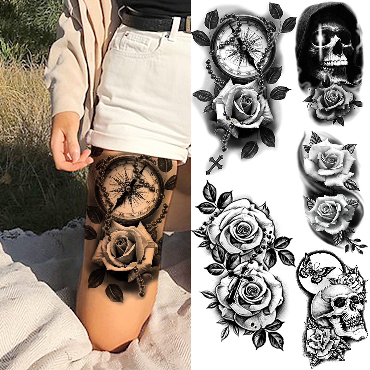 Sdrawing Black Rose Flower Compass Temporary Tattoos For Girl Men Skull Cross Butterfly Fake Tattoo Sexy Thigh Waterproof Tatoo