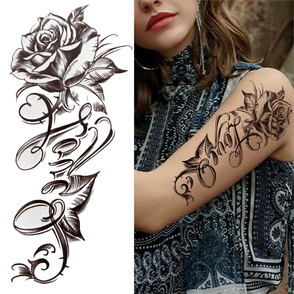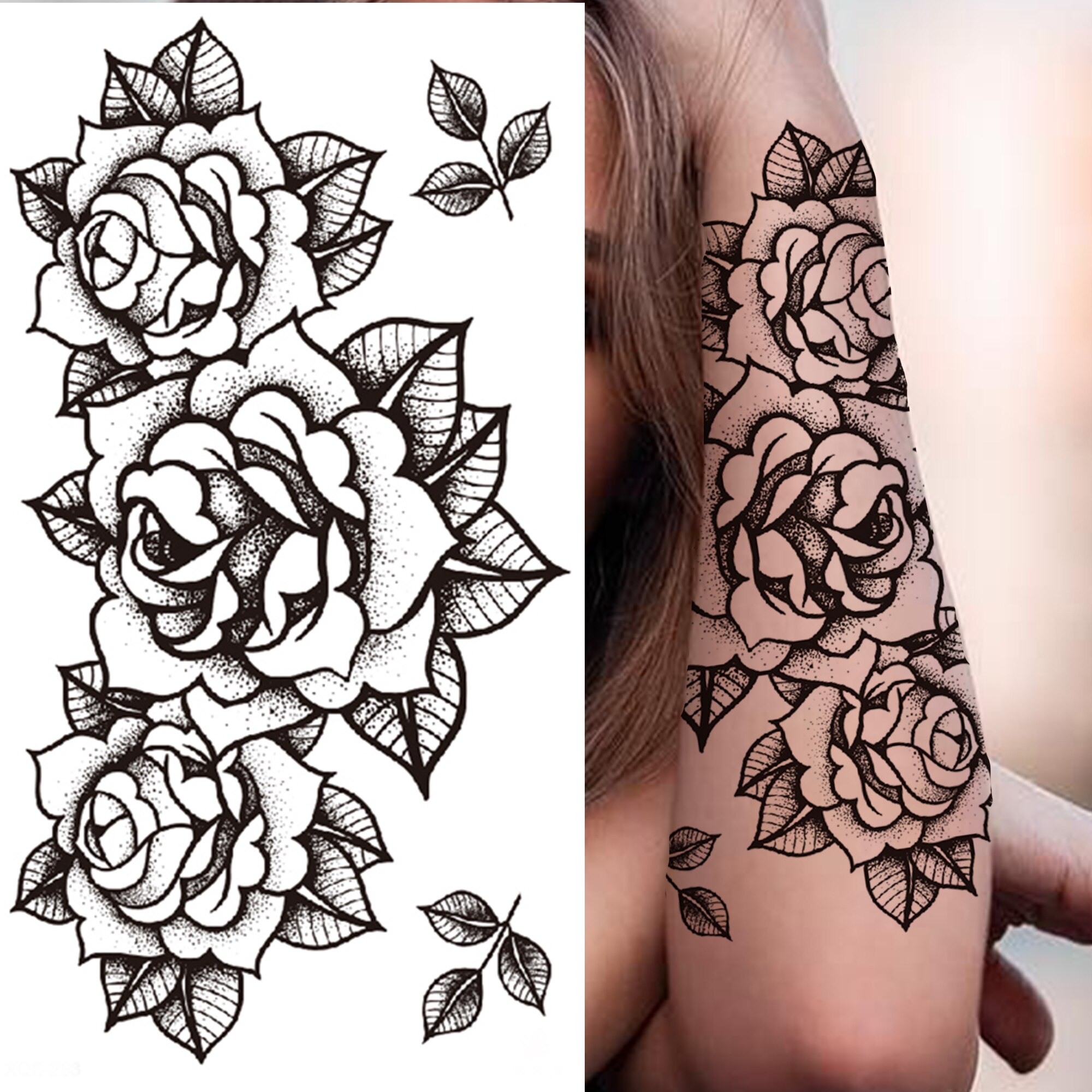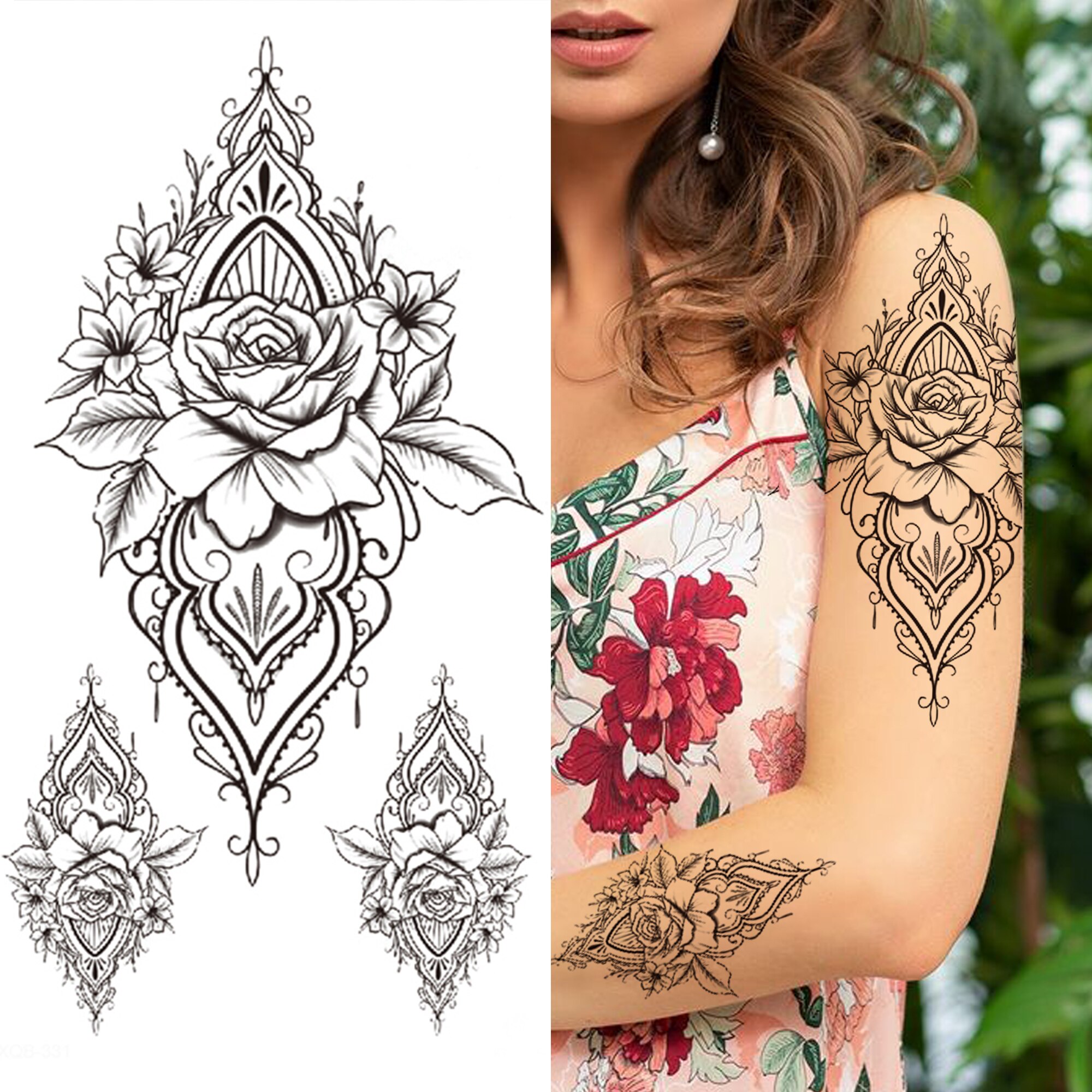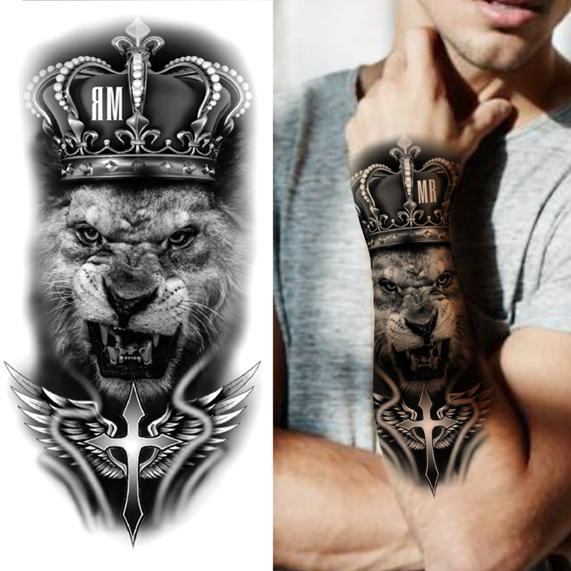 Sdrawing Compass Lion Rose Temporary Tattoo For Men Adults Realistic Fake Tiger Crown Cross Tattoo Sticker Thigh Half Sleeve Tatoo