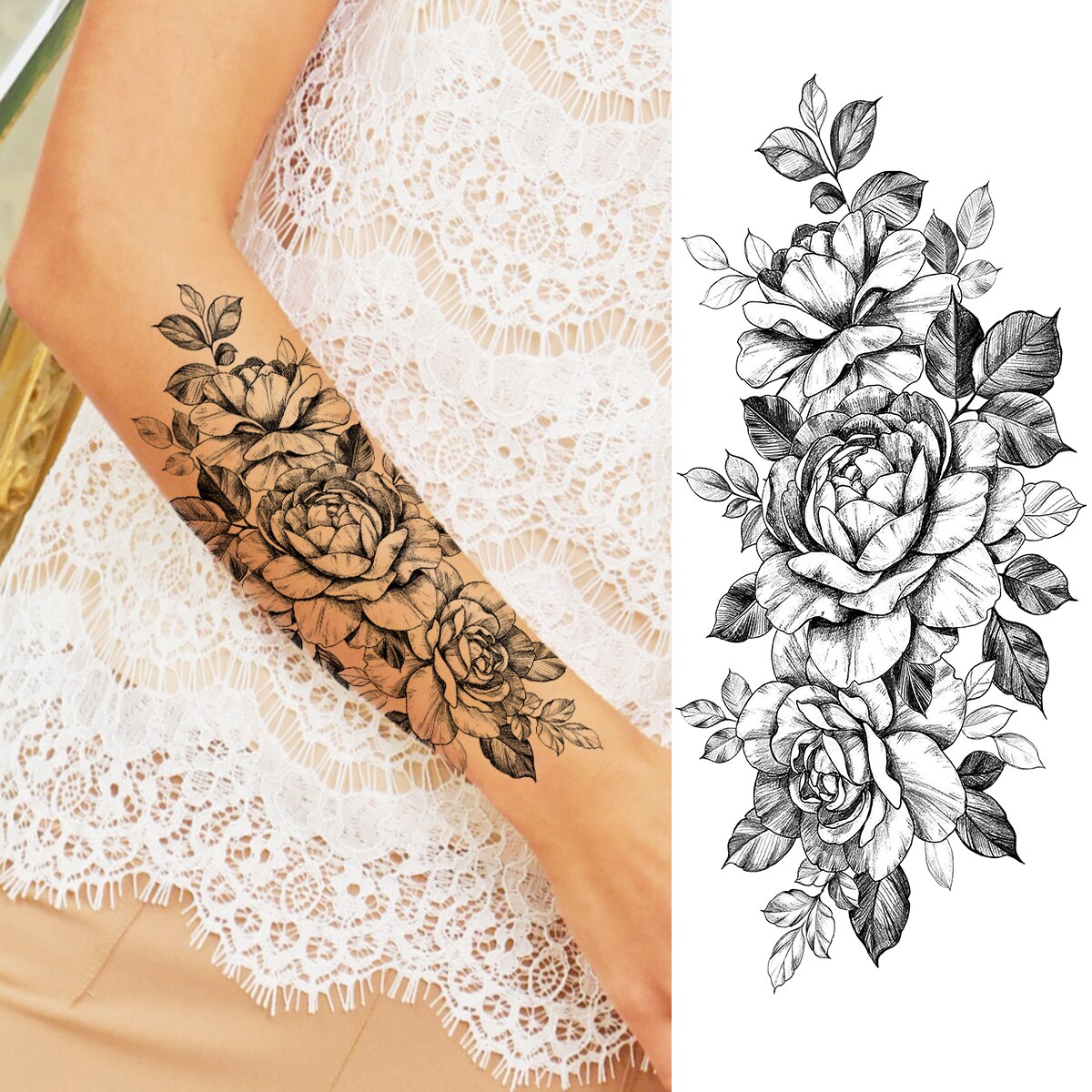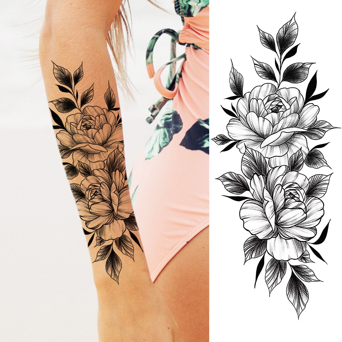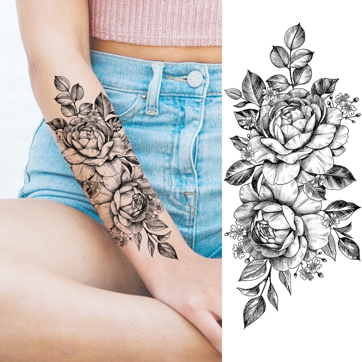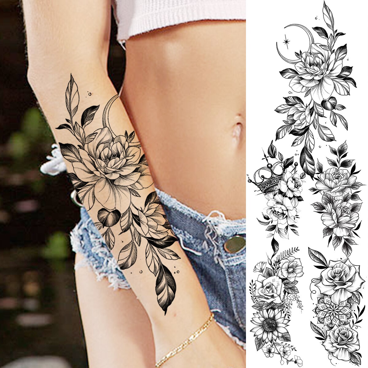 Sdrawing Peony Flower Moon Temporary Tattoos For Women Adult Rose Daisy Crown Fake Tattoo Fashion Washable Half Sleeve Tatoos