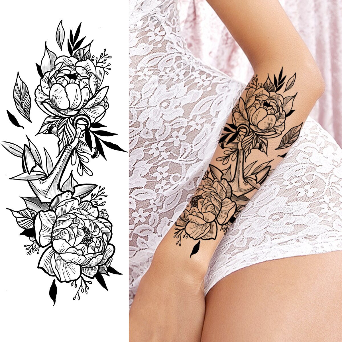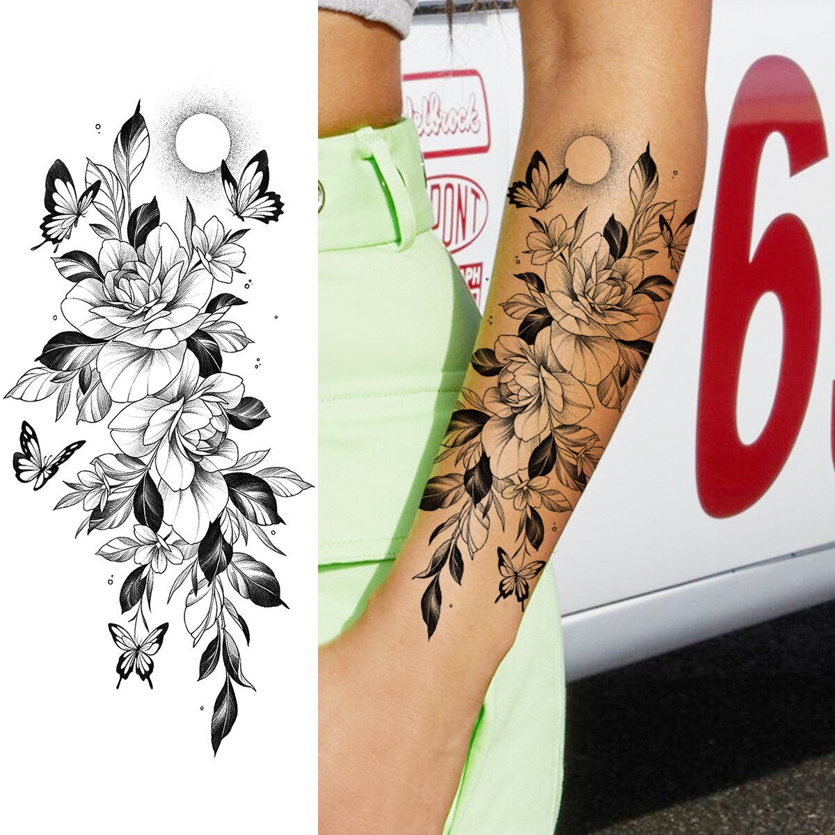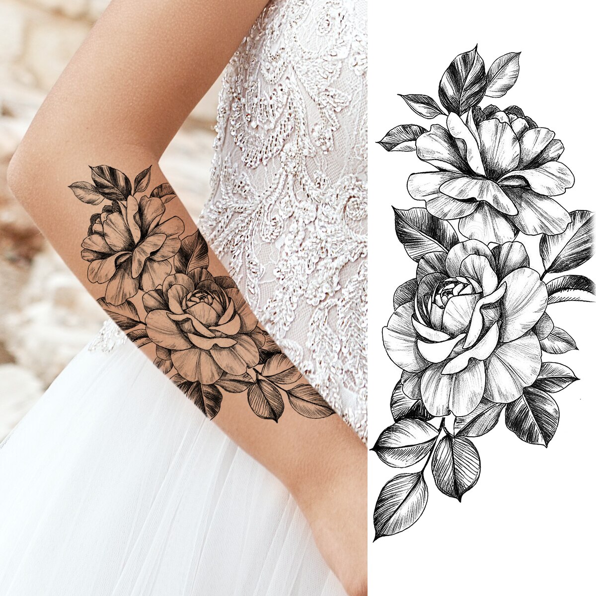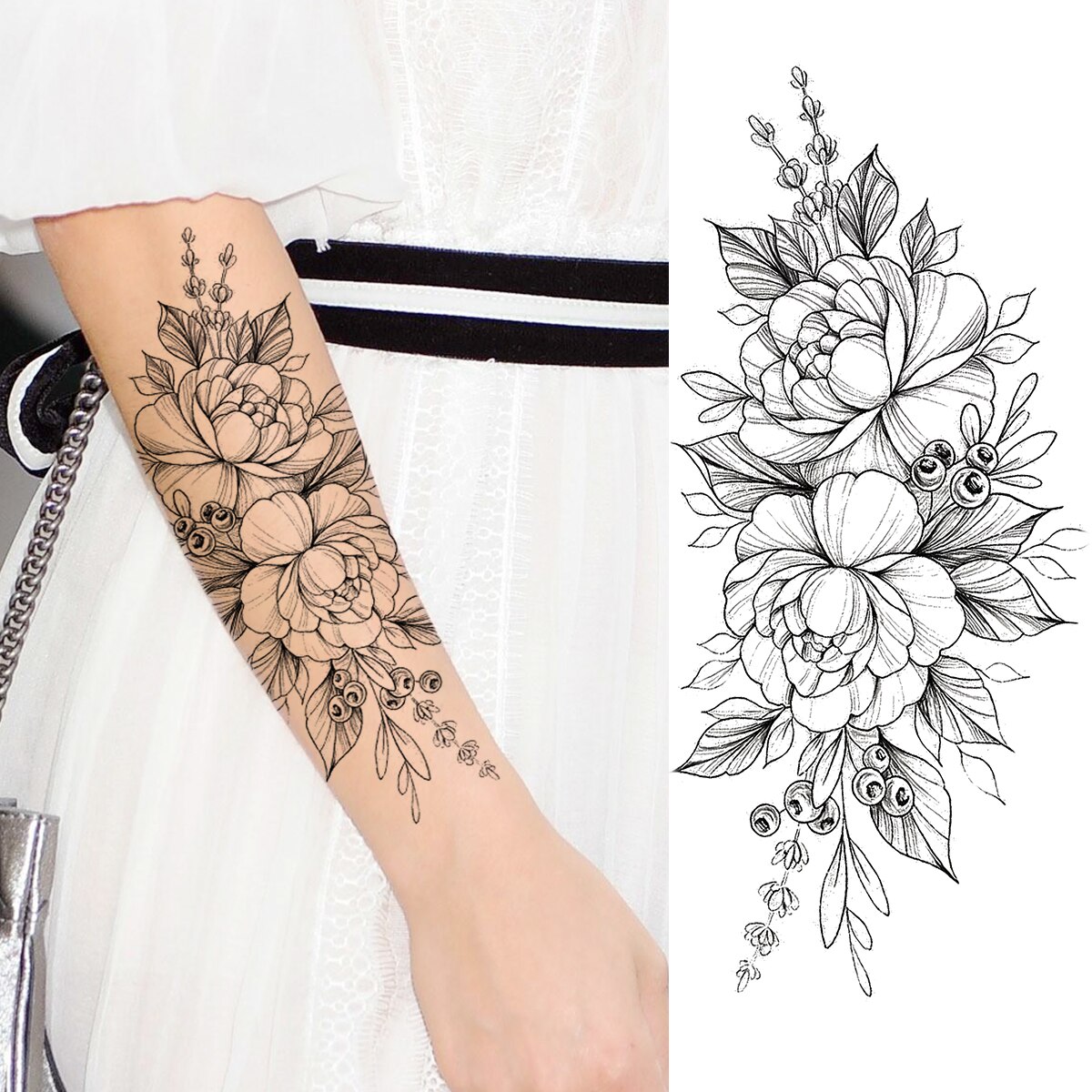 Sdrawing Peony Flower Moon Temporary Tattoos For Women Adult Rose Daisy Crown Fake Tattoo Fashion Washable Half Sleeve Tatoos
