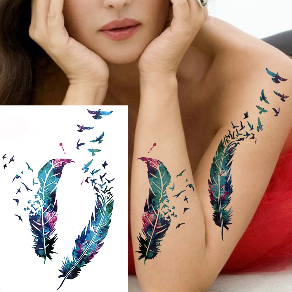 Watercolor Feather Bird Temporary Tattoos For Women Girls Clever Owl Hummingbirds Flower Tattoo Sticker Fake Tatoos Geometric