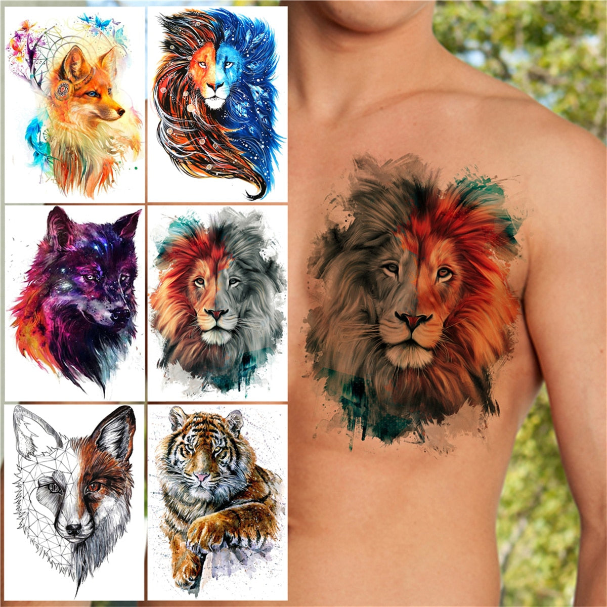 Watercolor Lion Temporary Tattoos For Men Women Adult Kids Wolf Tiger Tattoo Sticker Realistic Fake Animal Water Transfer Tatoos