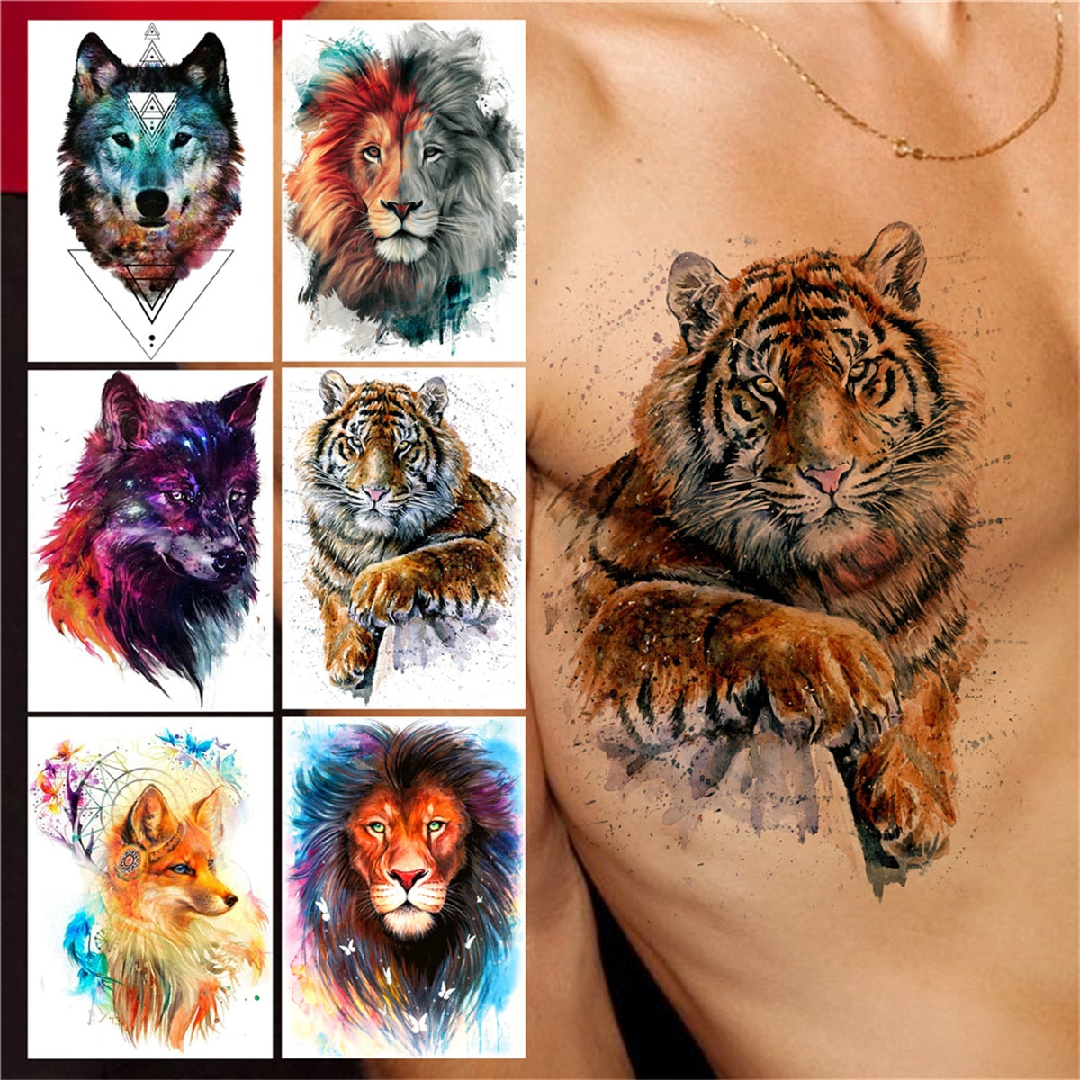 Watercolour Tiger Temporary Tattoos For Men Women Kids Boys Wolf Lion Tattoo Sticker Animal Realistic Fake Body Tatoos Supplies