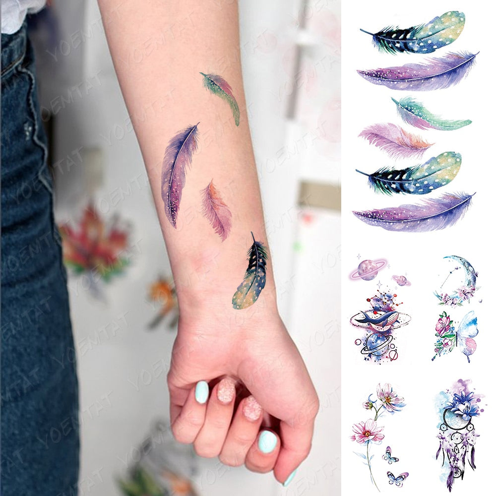 Waterproof Temporary Tattoo Sticker Colorful Fantasy Feathers Flash Tatoo Watercolor Universe Fake Tatto For Body Art Women Men