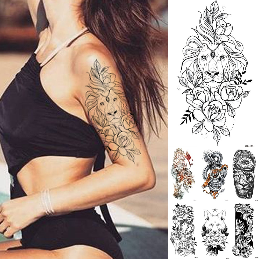 Waterproof Temporary Tattoo Sticker Lace Rose Flowers Lion Flash Tattoos Wolf Fox Body Art Arm Fake Sleeve Tatoo Women