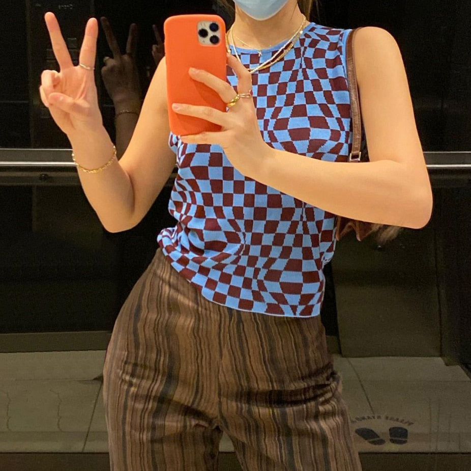 Women Summer Checked Crop Top Female Sleeveless Knitted Vest Plaid Printed Y2K Tank Top Streetwear Fashion Aesthetic Cute Shirts