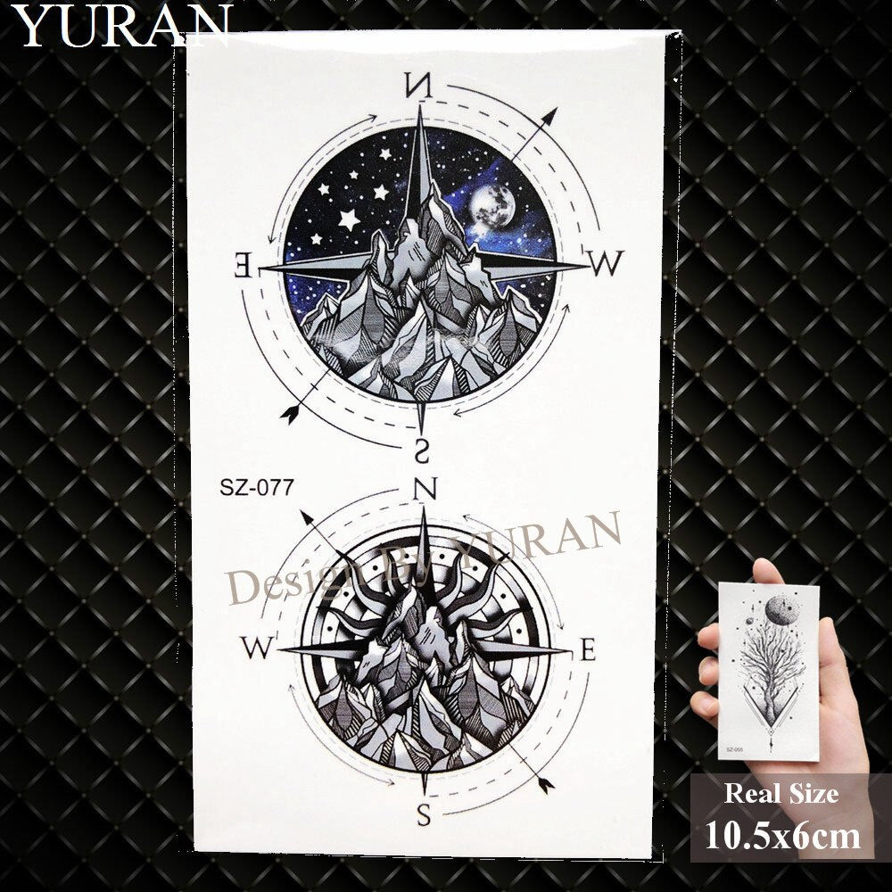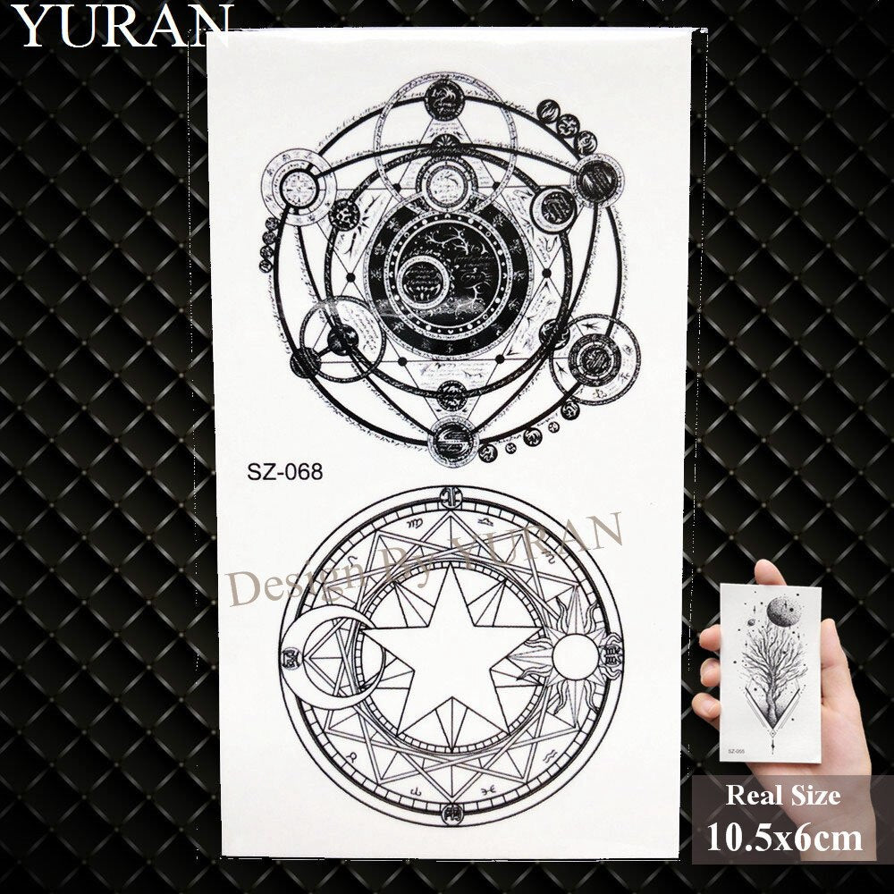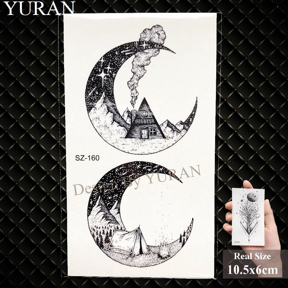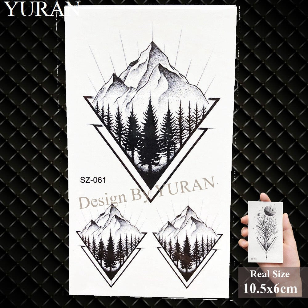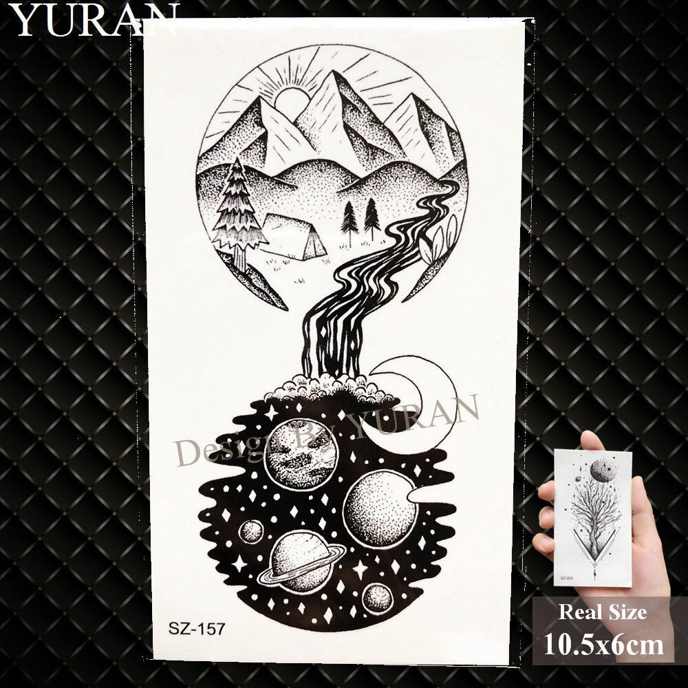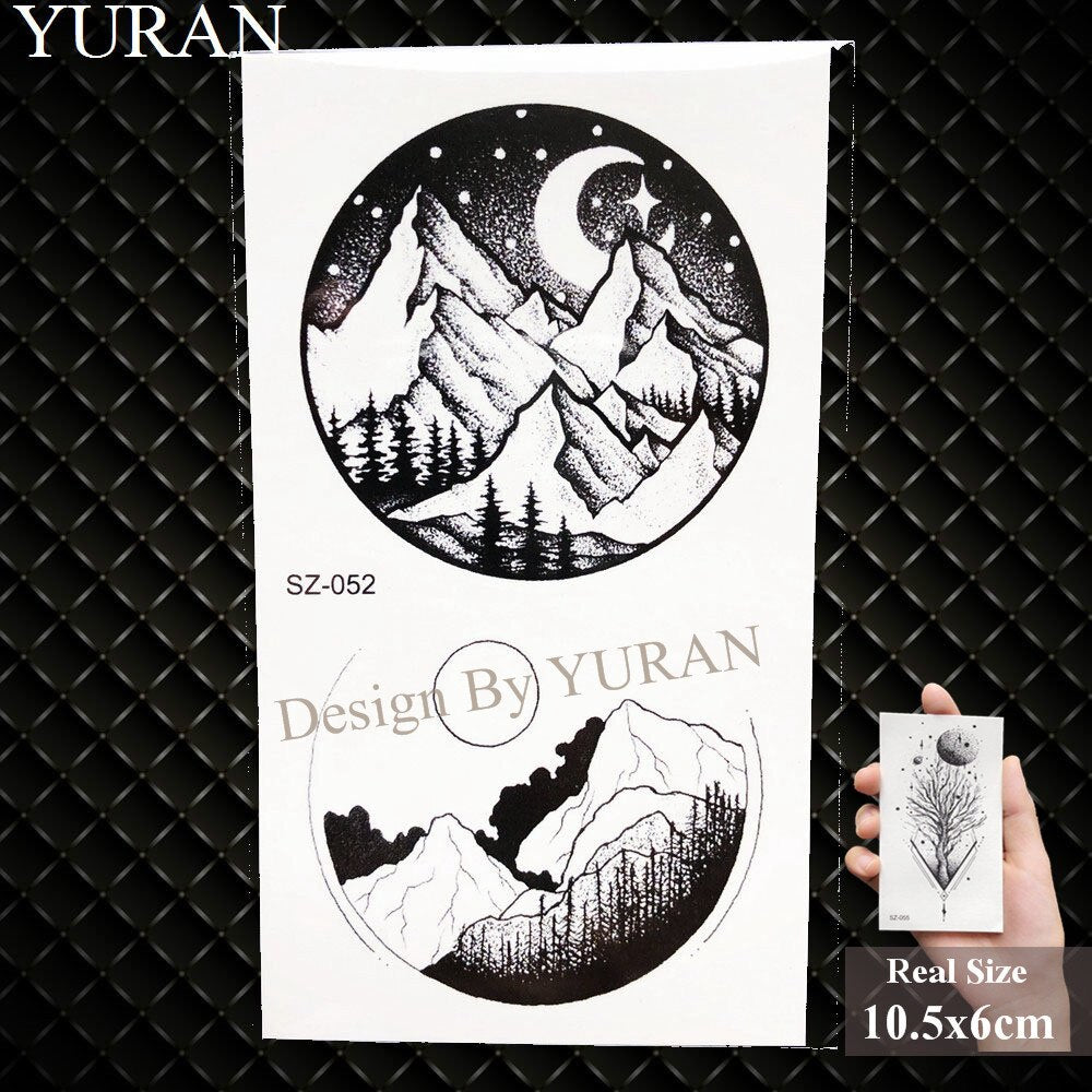 YURAN Black Mountain River Geometric Tattoo Stickers Women Body Arm Moon Temporary Tattoo Men Ankle Wolf Round Fake Tatoo 3D